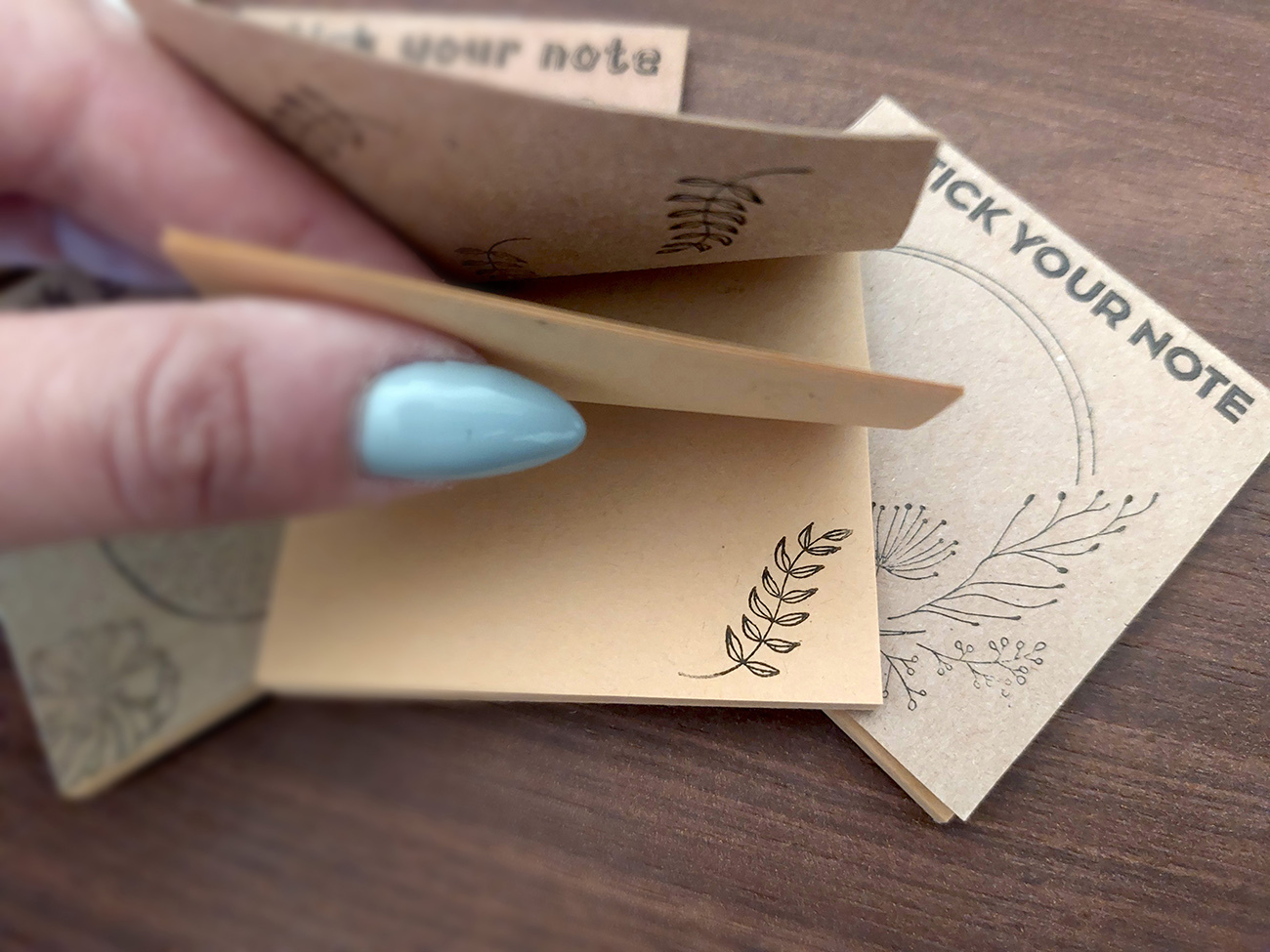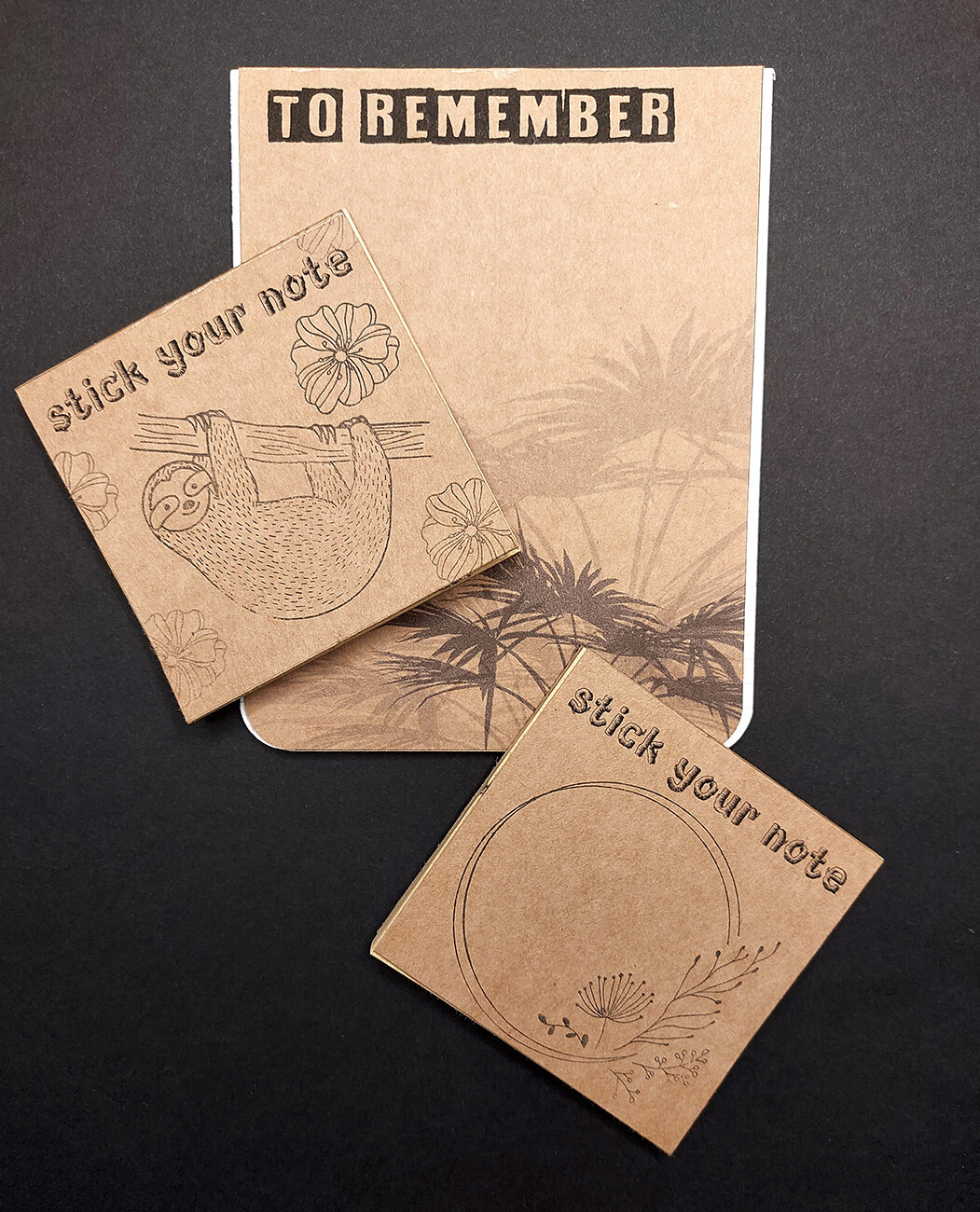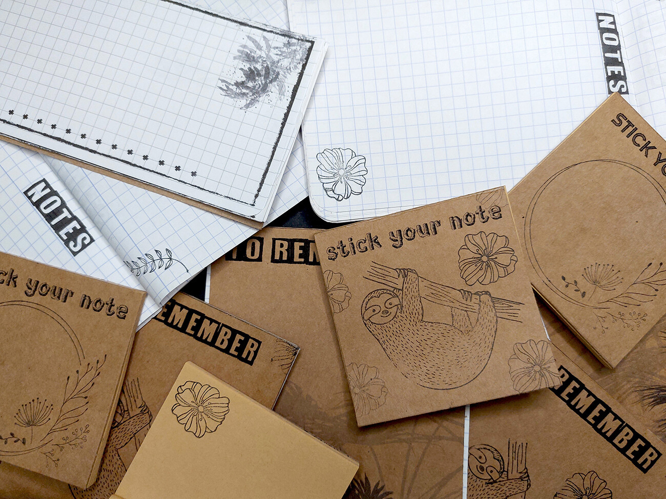 Handcrafted on eco-brown paper, every block concludes in 25 uniquely stamped sticky notes.